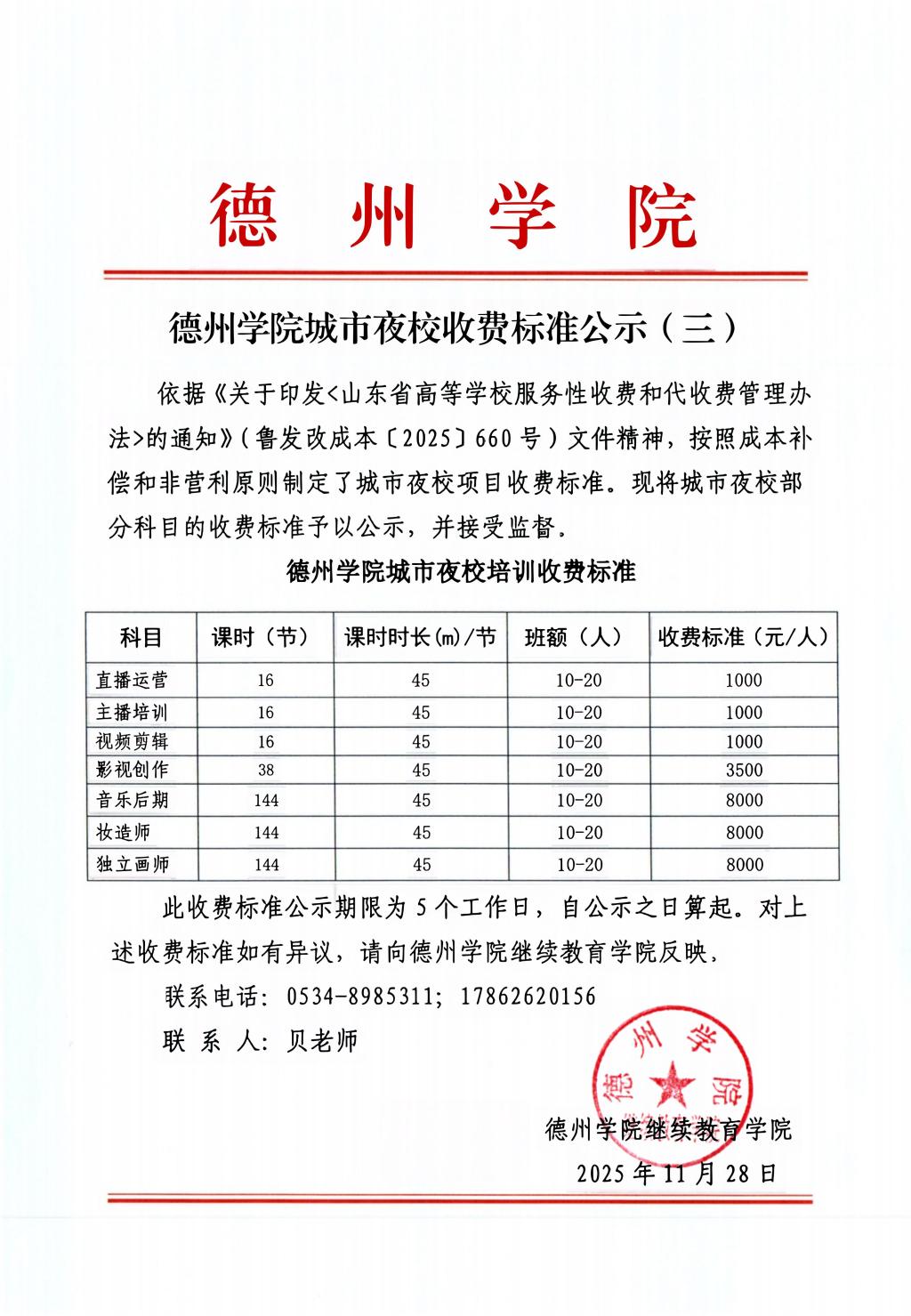德州学院城市夜校收费标准公示(三)