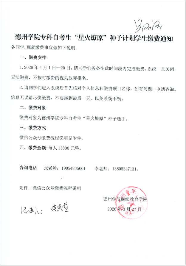 德州学院专科自考生“星火燎原”种子计划学生缴费通知