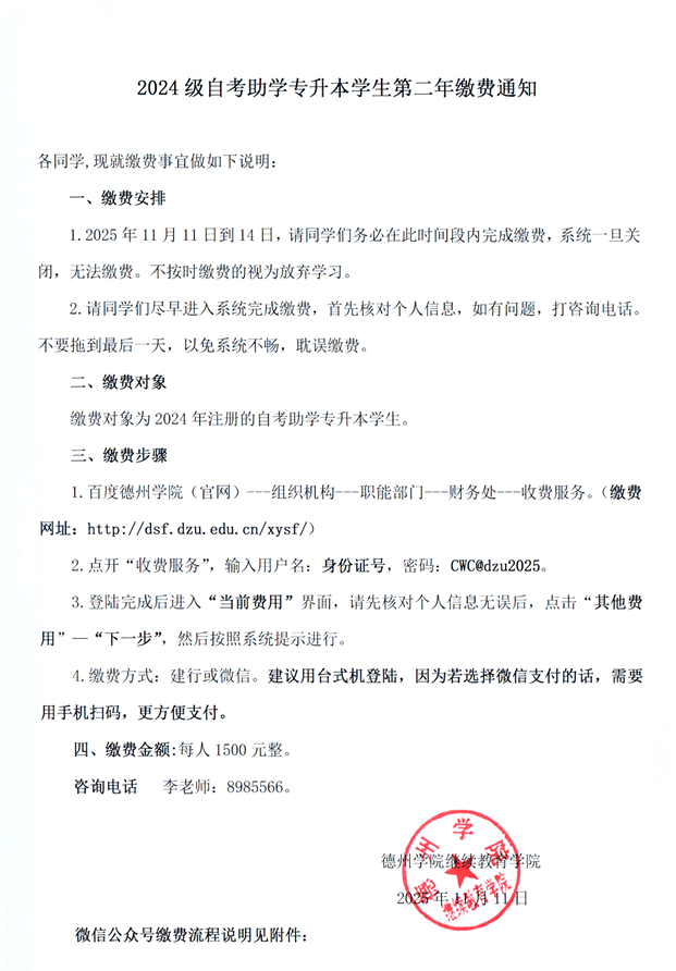 2024级自考助学专升本学生第二年缴费通知