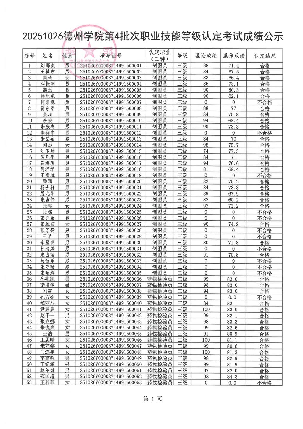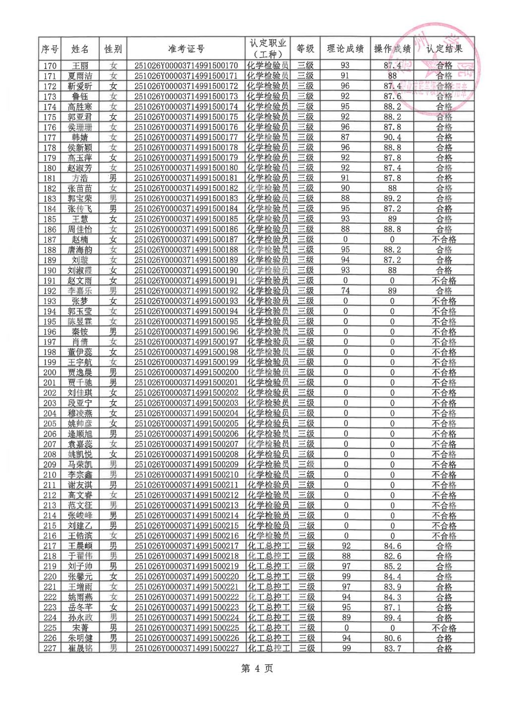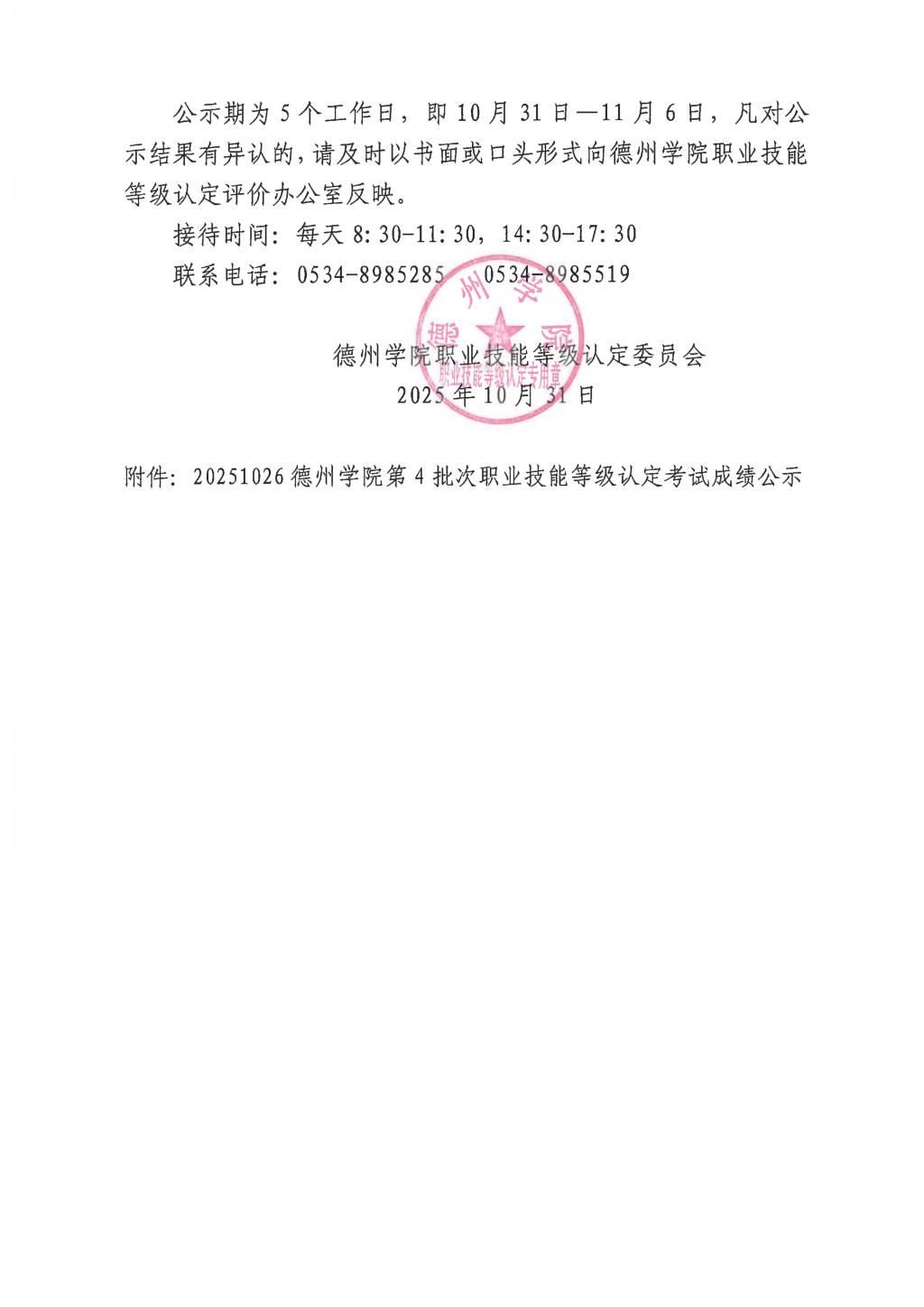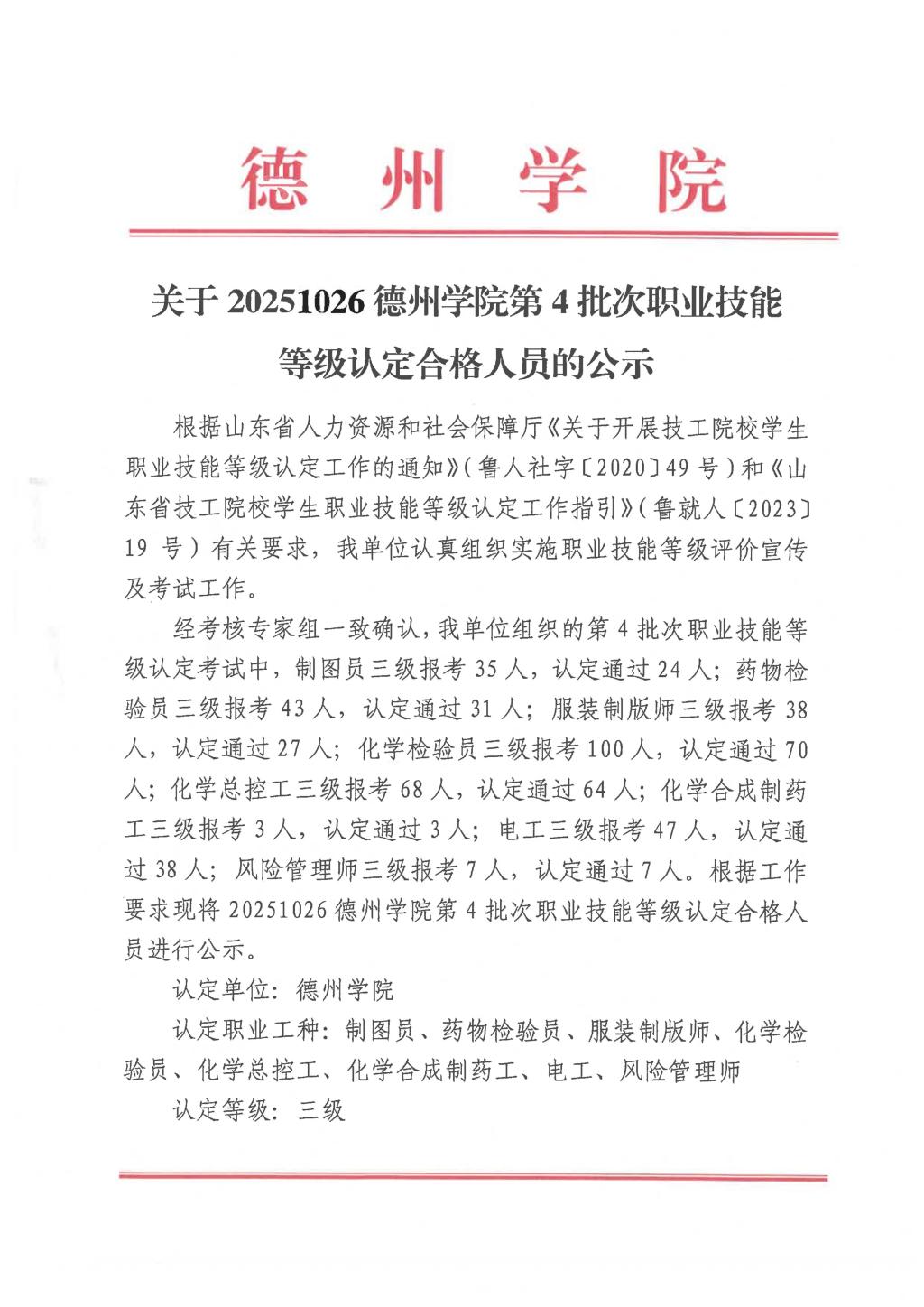 关于20251026德州学院第4 批次职业技能等级认定合格的人员的公示