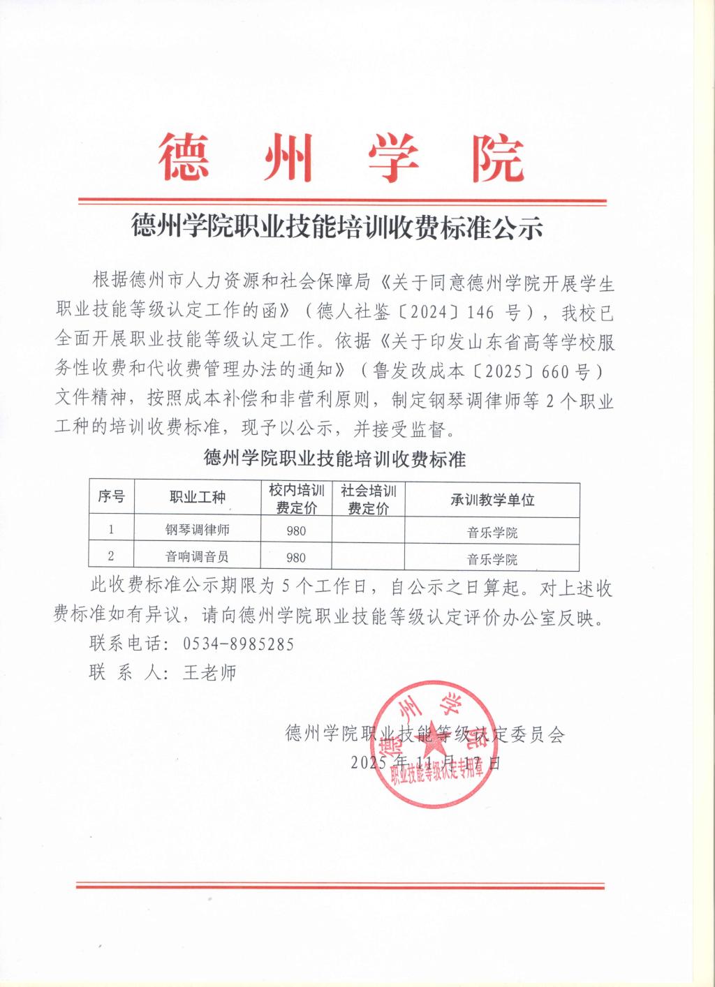 德州学院职业技能培训收费标准公示