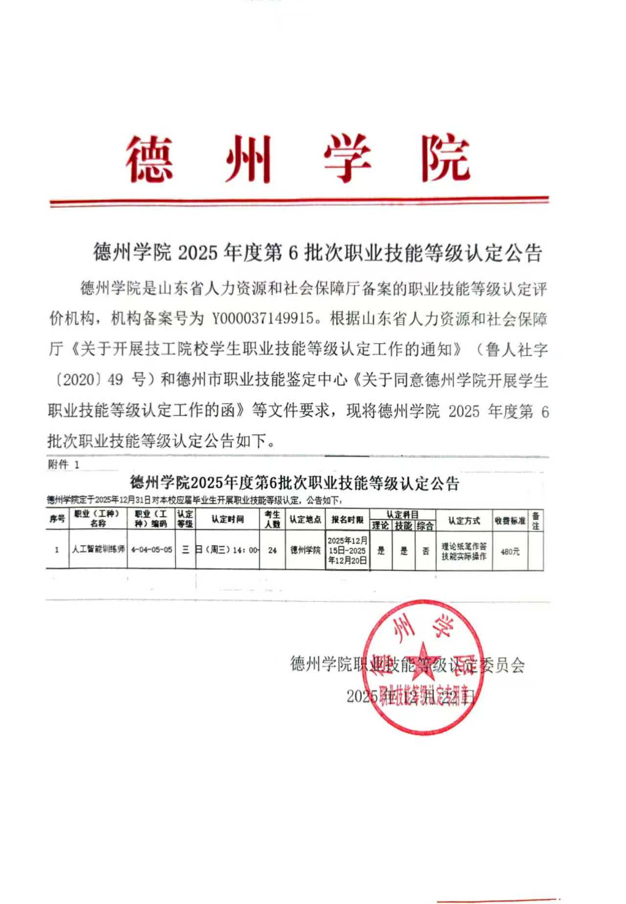 德州学院2025年度第6批次职业技能等级认定公告