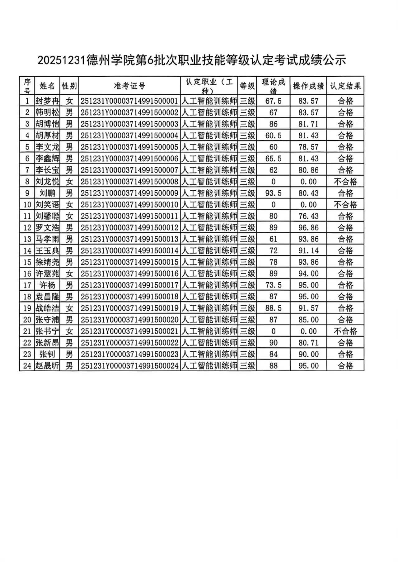 关于20251231德州学院第6批次职业技能等级认定合格人员的公示